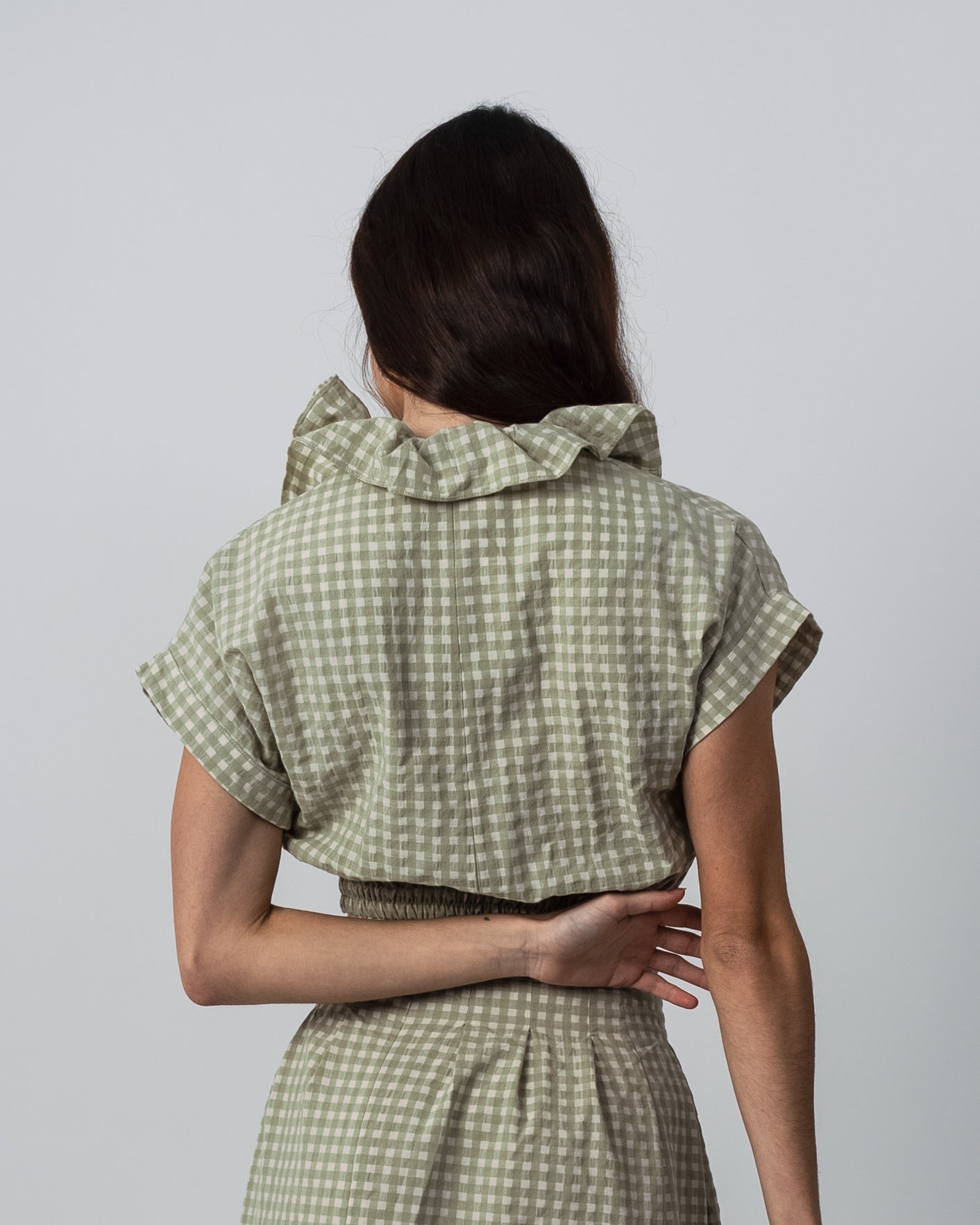 Blusa Vichy Romance — estampado de cuadros Vichy color té verde y vainilla.