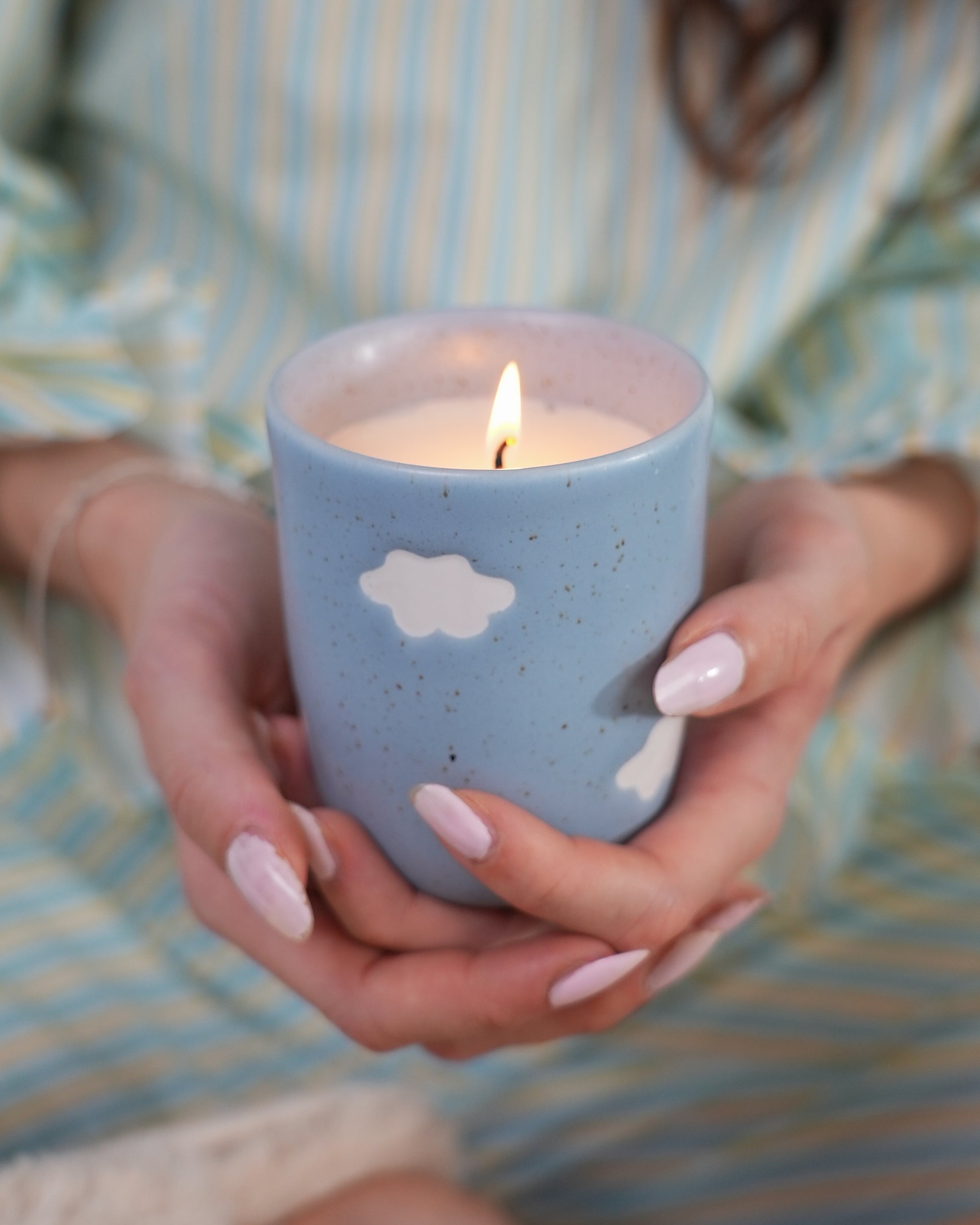 Vasito de cerámica de Egg Back Home — hecho a mano en Portugal, con una vela de cera de soja y aceites esenciales de canela en rama.