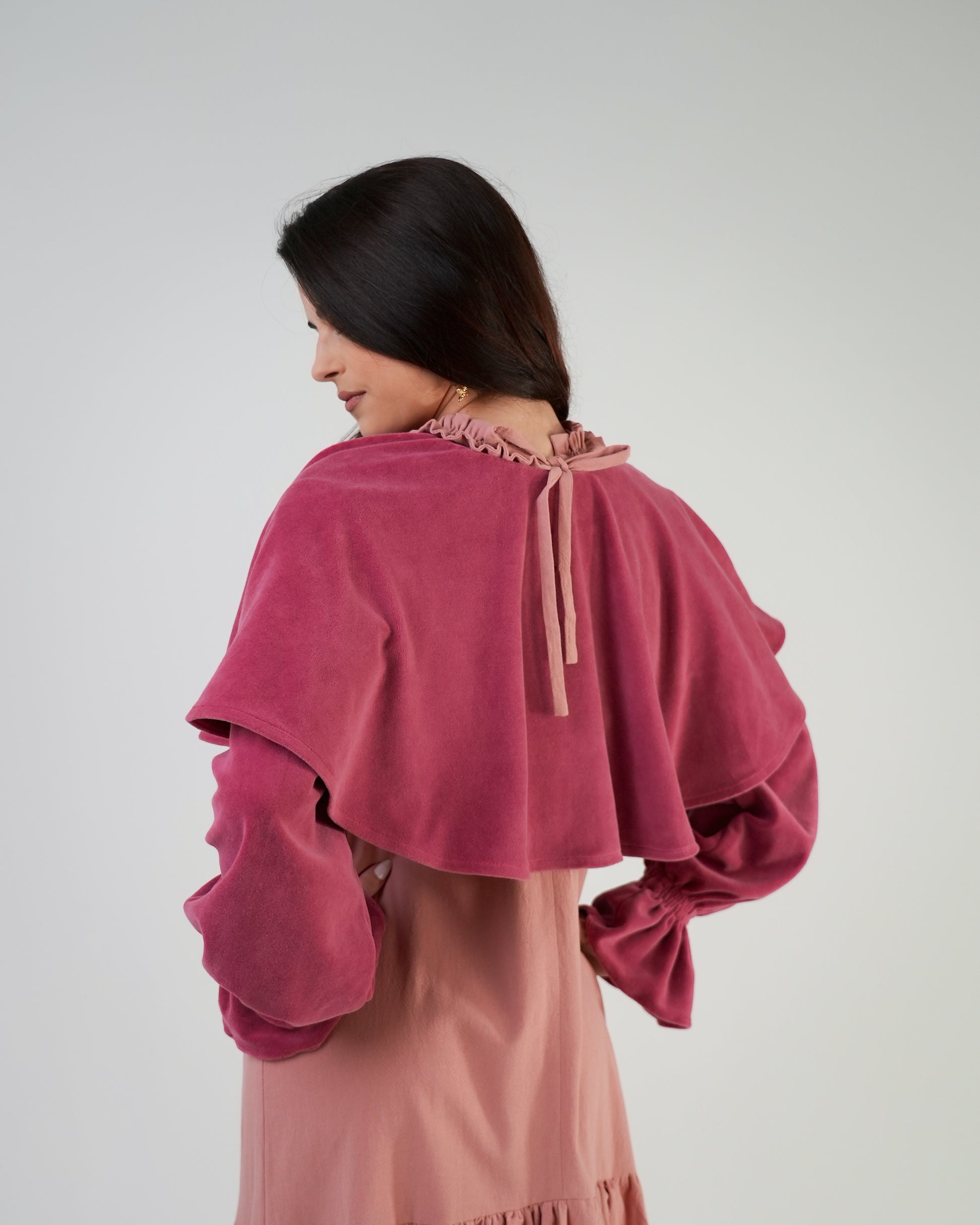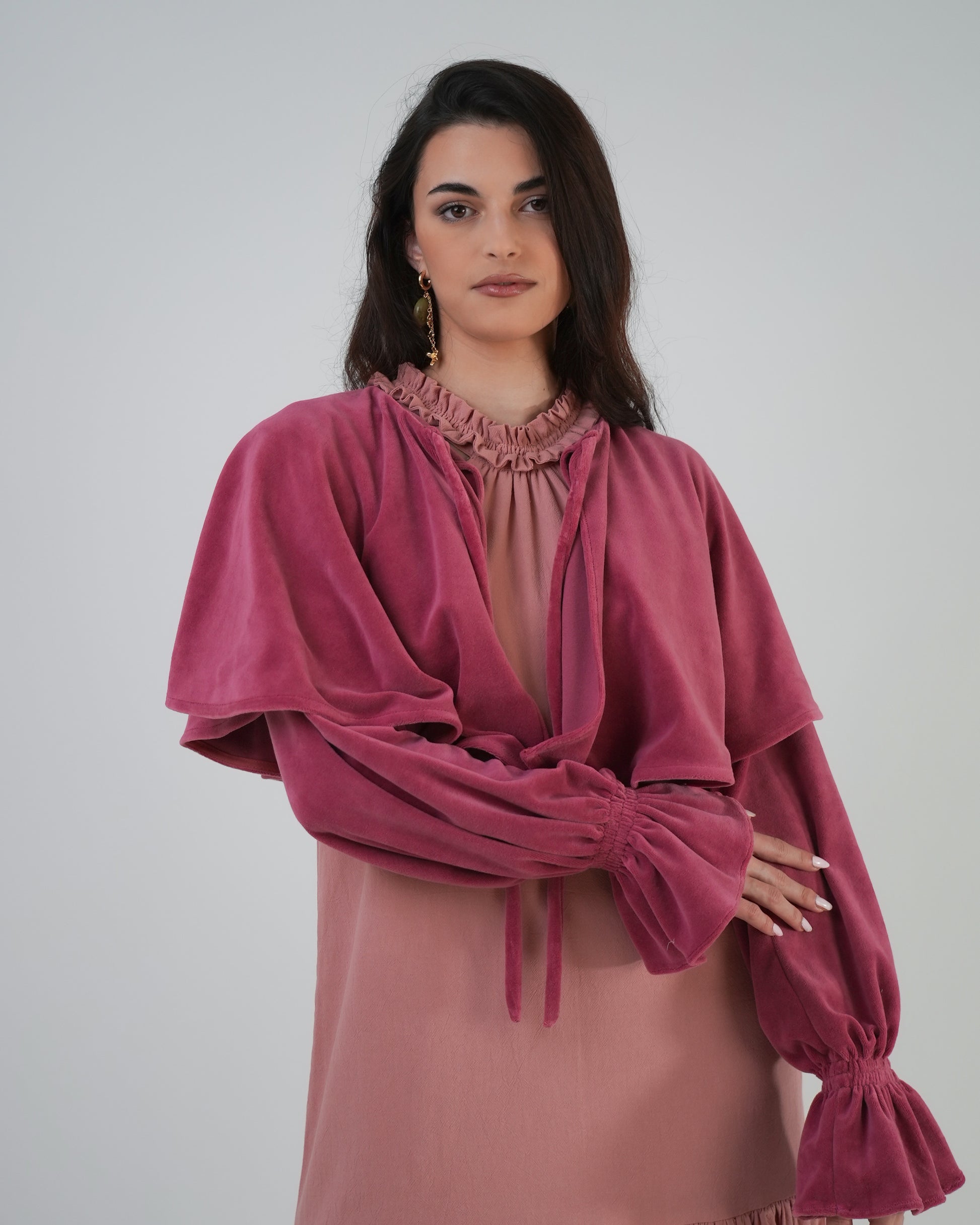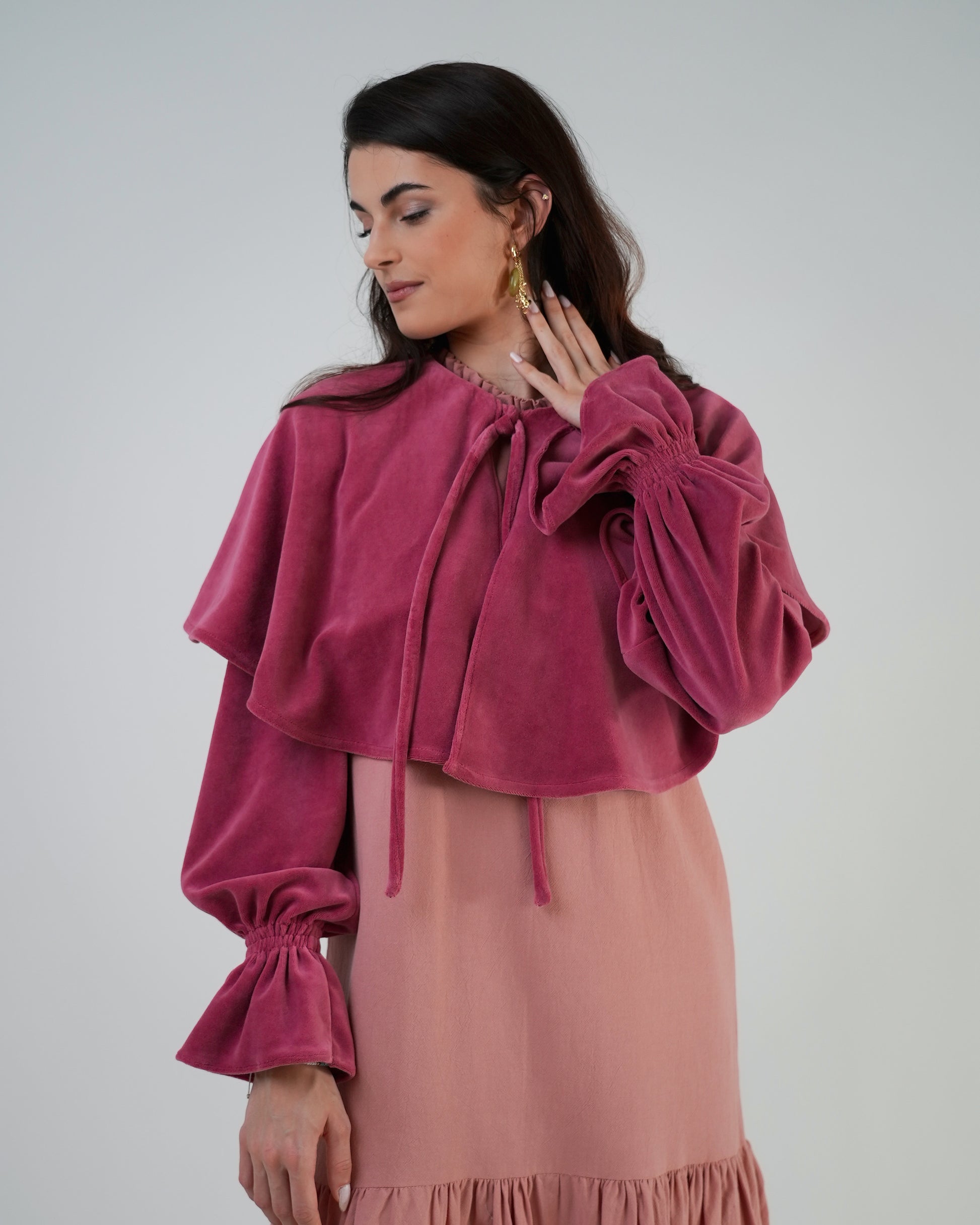 • Corte: capa con manga obispo. Cierre del cuello con lazada.