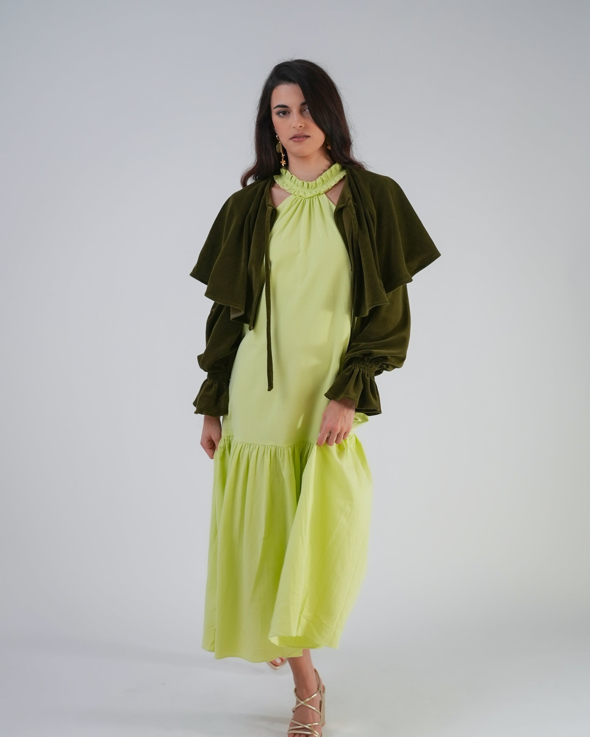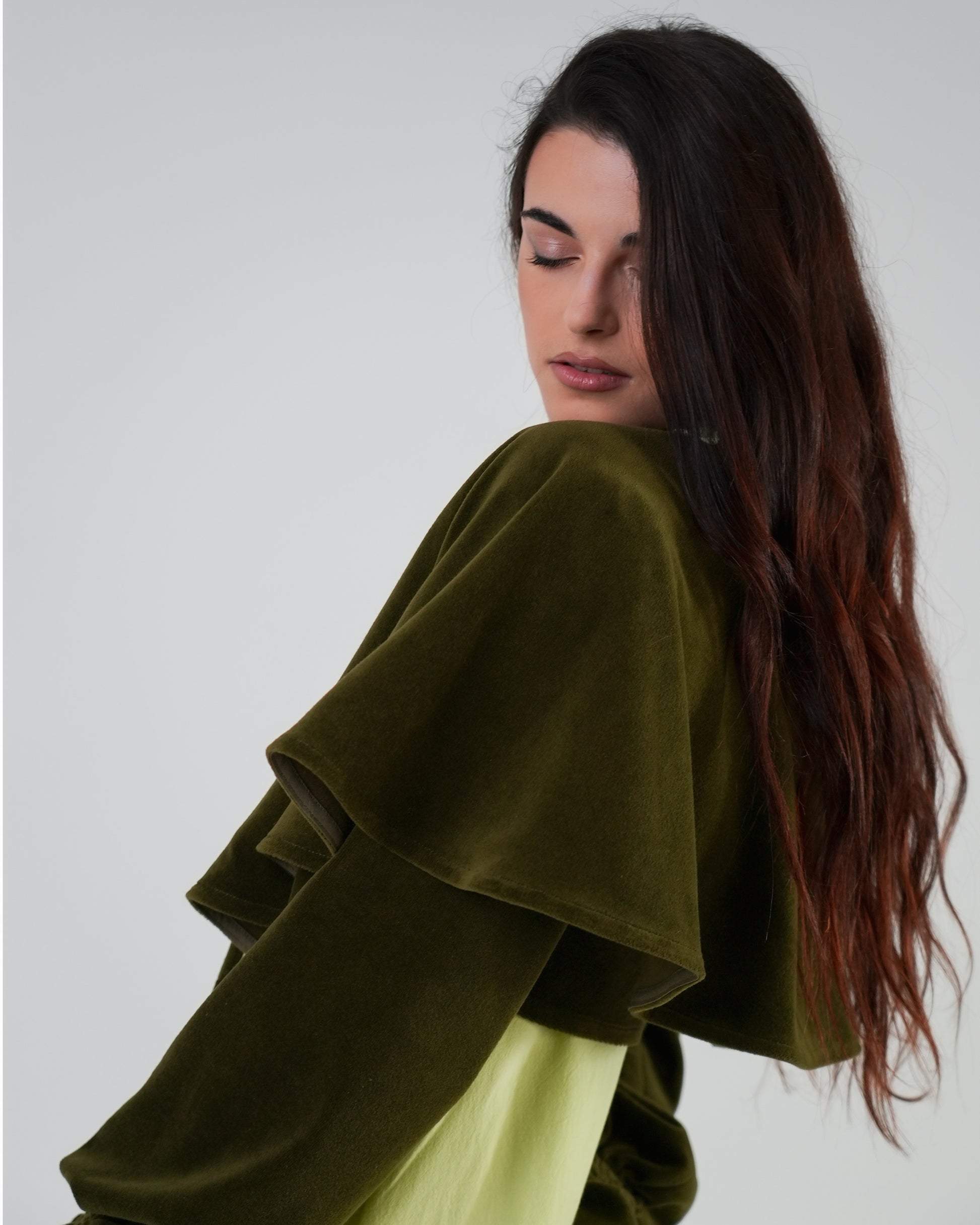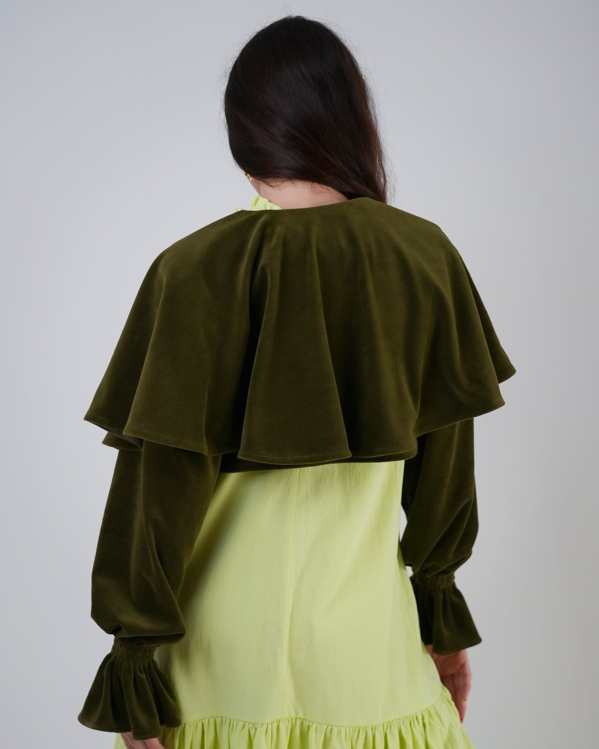 • Corte: capa con manga obispo. Cierre del cuello con lazada.