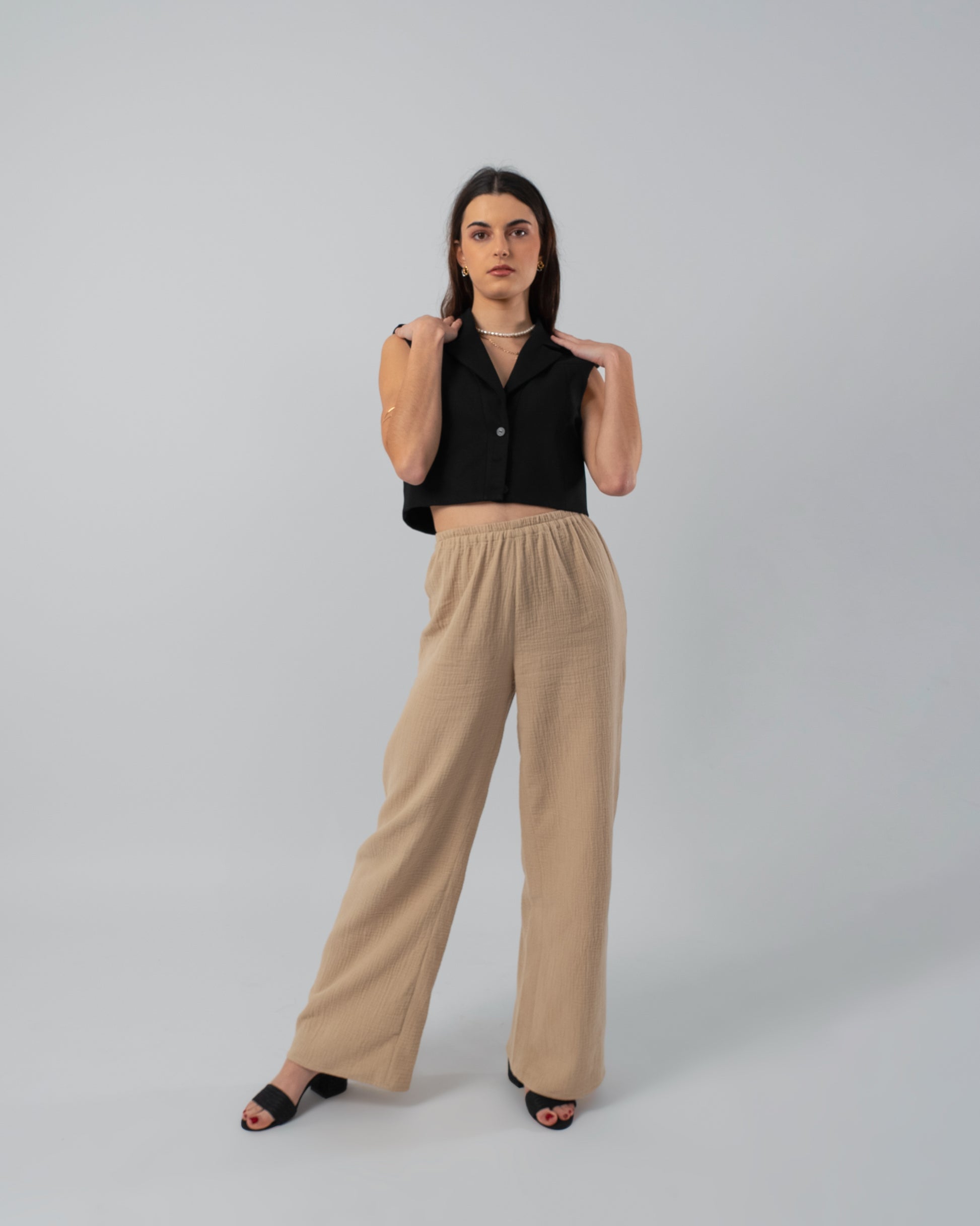 Su diseño de cintura elástica garantiza comodidad y un ajuste favorecedor, mientras que su corte amplio aporta movimiento y sofisticación.